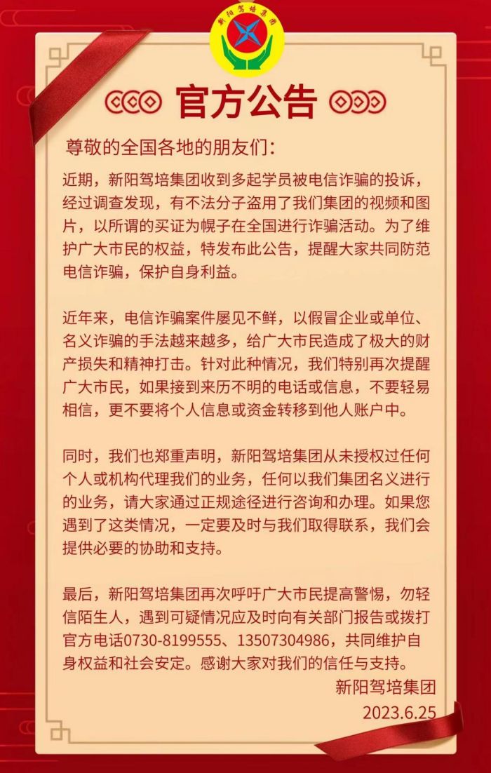 最后,新陽駕培集團再次呼吁廣大市民提高警惕,勿輕信陌生人,遇到可疑情況應及時向有關部門報告,共同維護自身權益和社會安定。感謝大家對我們的信任與支持。